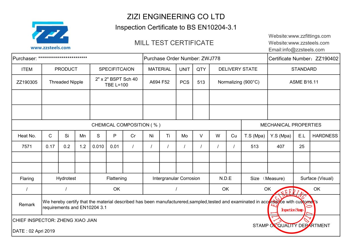 Zizi is a ISO certified manufacturer and we obtained many cetificate such as TUV, BV and IQNet. Our products cover forged threaded fittings, forged socket weld fittings, wrought fittings and forged flanges. They are all high quality and supplied with MTC.