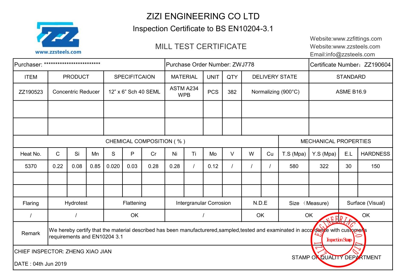 Document: CI, PL, CO, BL, MTC of ASTM A234 WPB Concentric Reducer