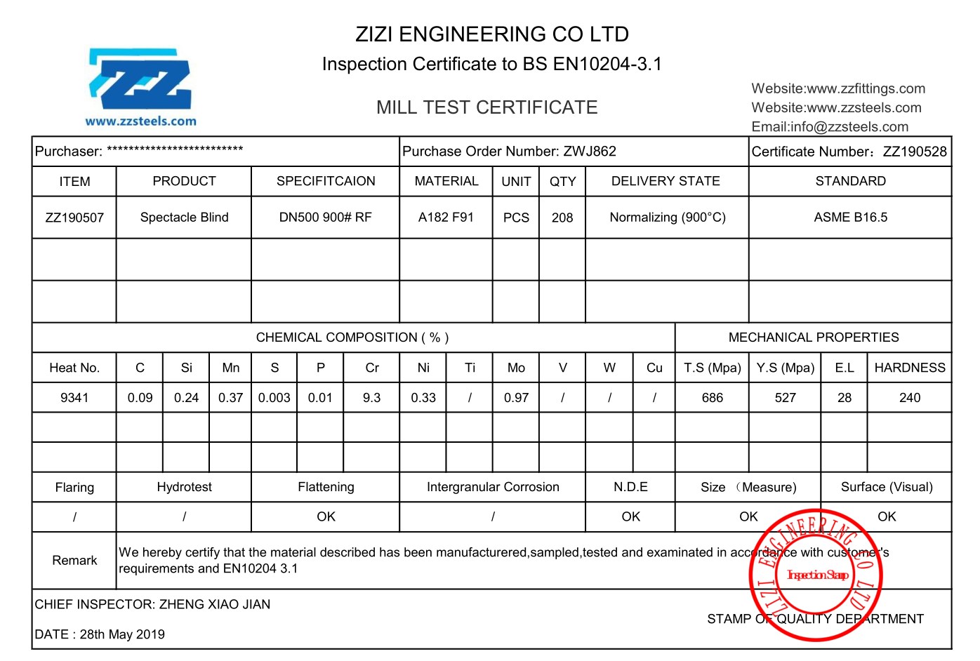 High quality forged flanges supplier Zizi offers DN500 Class 900 spectacle blind RF ASTM A182 F91 for Australia, those flanges are manufactured according to ASME B16.5.
