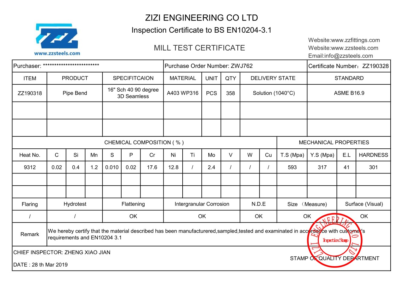 ASTM A403 WP304 Chemical Composition