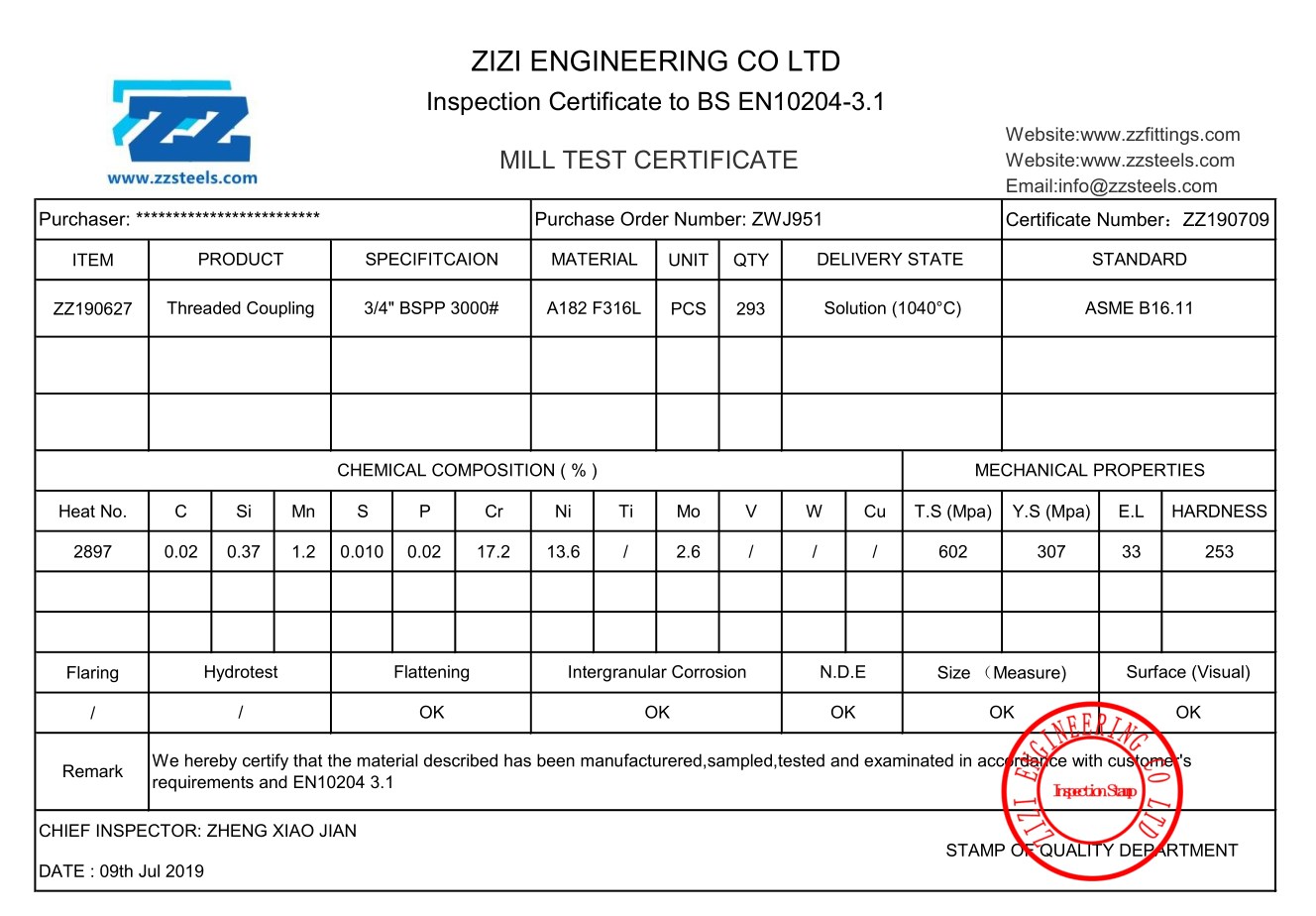 - Test the threads and chemical composition of SS316 3/4″ threaded coupling.